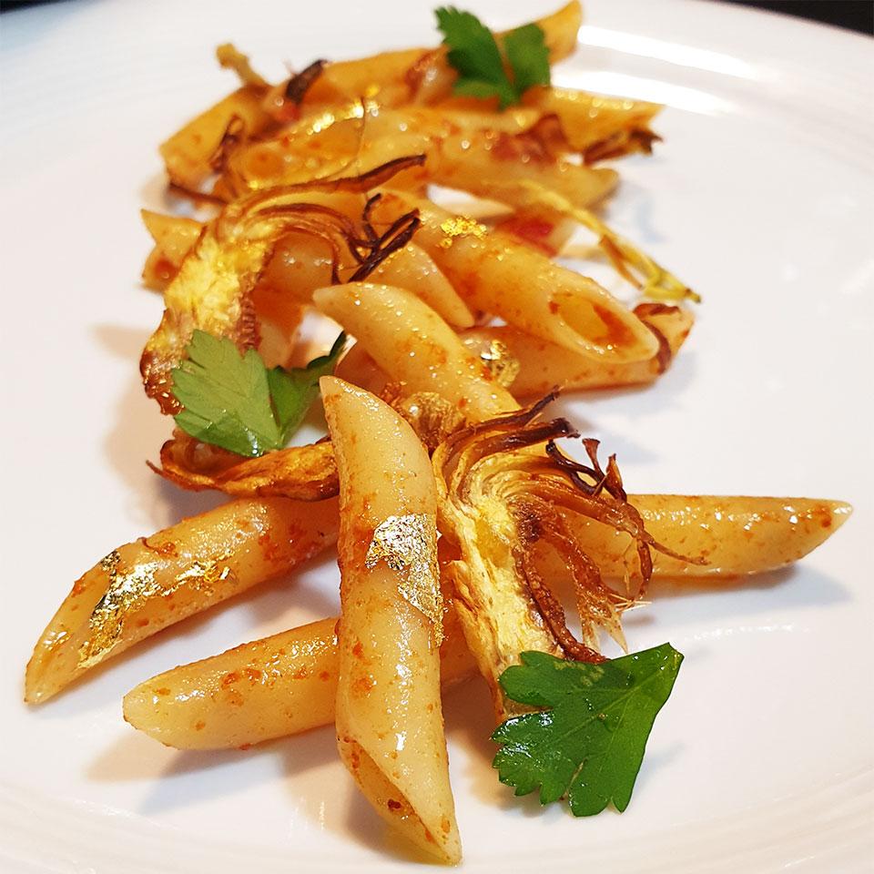 Quelle nella foto sono con ricci di mare, carciofi croccanti e oro. Cuoca Mariangela Ruggiero, Osteria Bepi da Guia, Arbatax, Nuoro.