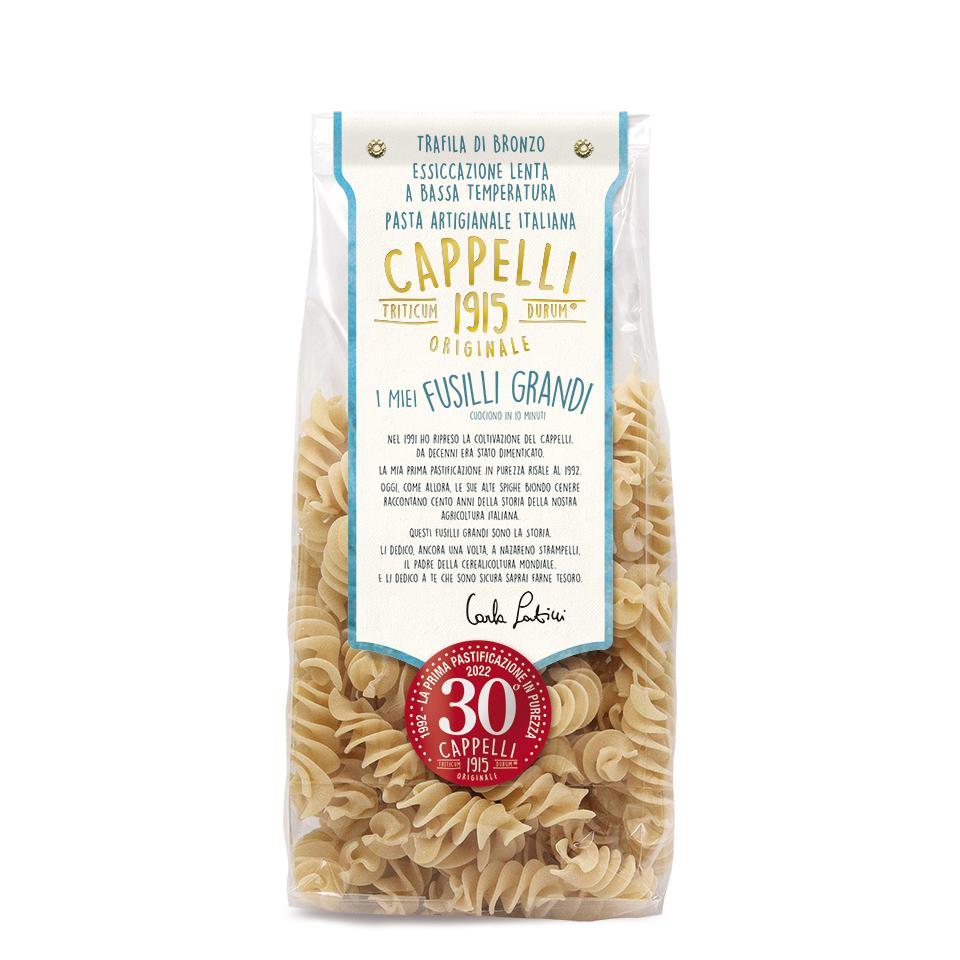 Per celebrare i 30 anni del nostro Cappelli Originale 1915 ci siamo inventati questi Fusilli Grandi. Voluttuosi e avvolgenti. Ben disposti a farsi catturare dai vostri condimenti. Ottima tenuta in cottura e morso corposo. Da provare!