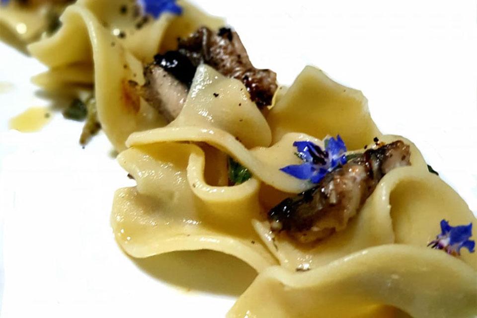 Sono un spettacolo questi trucioli di Mariangela Ruggiero con l'anguilla marinata al trombolotto e la borraggine.Siamo all'Hotel Mediterraneo a Ogliastra, in provincia di Alghero, in Sardegna