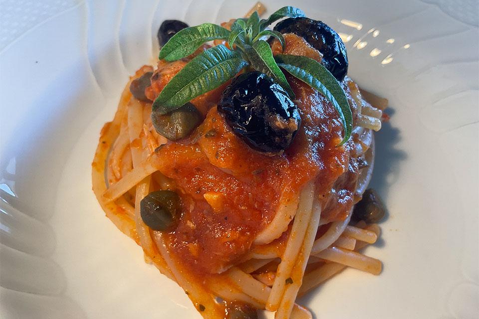 Nel sugo con tonno, capperi, passata di pomodoro, alici e aglio di Nubia.