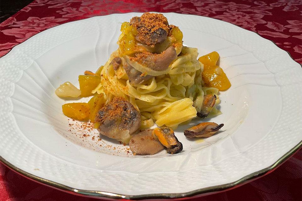 Fate una crema di zucca, meglio se la cucinate al forno o a vapore, frullatela con una piccola patata. Nel frattempo fate rosolare i funghi in poco extravergine con uno spicchio d'aglio se gradite e fate aprire in padella le cozze. Unite il tutto, aggiustate di sale, se necessario, saltateci i tagliolini, Pasta di casa, al dente e spolverate di bottarga in polvere. Una vera bontà