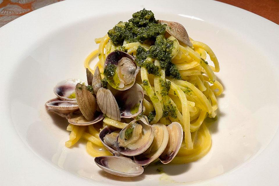 Con la Chitarra all'uovo, Pasta di Casa, un piatto vivace con tanti colori. C'è il giallo intenso della pasta all'uovo, il verde brillante del pesto, le sfumature di grigio dei gusci delle vongole. A Casa Latini ci piace pasticciare un po' e mangiare le vongole con le mani. Buon fine settimana!