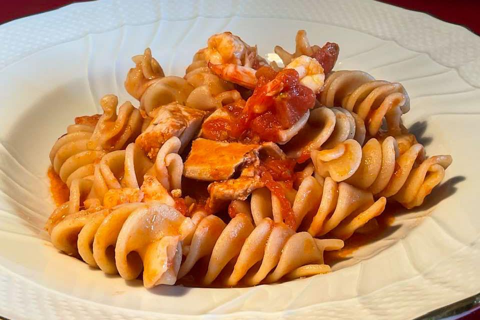 Per questo 4 Marzo 2023 Fusilli Grandi Cappelli Originale 1915, mazzancolle dell'Adriatico, coda di rospo e pomodori pelati. La coda di rospo a dadini cucina in aglio appena scaldato in olio extravergine d'oliva con l'aggiunta di un paio di pomodori pelati. Le mazzancolle, private del carapace con cui faremo un fumetto per allungare il condimento, le saltiamo, invece, in padella antiaderente qualche secondo. Solo a fine cottura le uniamo al sugo. Abbiamo scelto i Fusilli Grandi. Provate a scoprire perché.