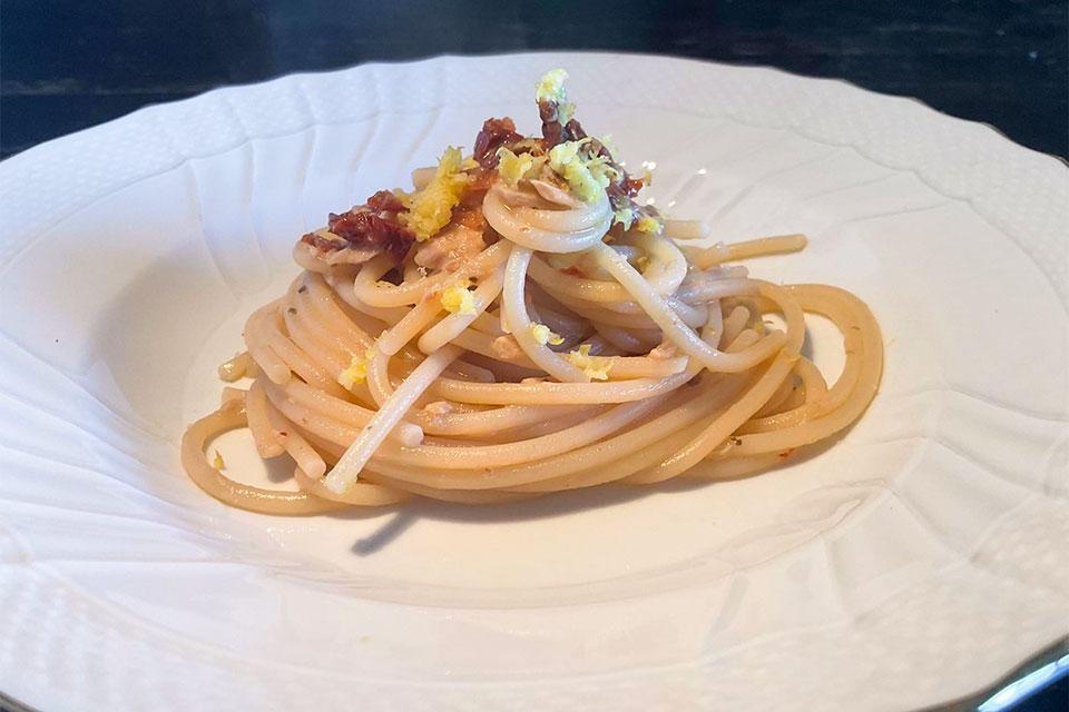 ... vi proponiamo questi spaghetti grandi con tonno, pomodori secchi, succo di pompelmo e sua buccia grattugiata. Contrasti, acidità, dolcezze. Velocità e leggerezza perché non aggiungiamo l'olio extravergine d'oliva. E' tutto già tutto ben condito. Buon Giovedì