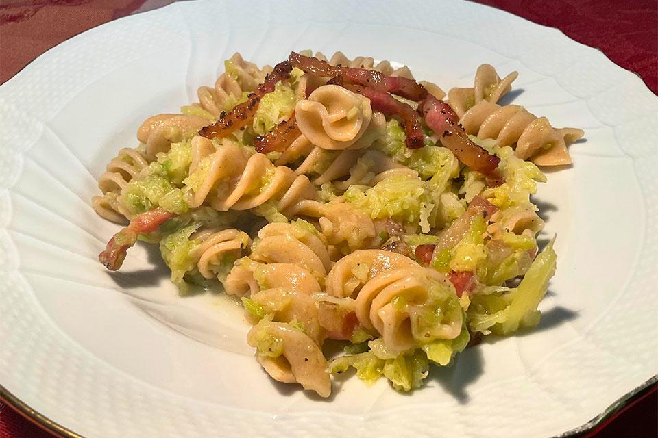 Oggi con cipolla rossa a julienne, verza soffocata e guanciale. Un po' croccante e un po' no.
