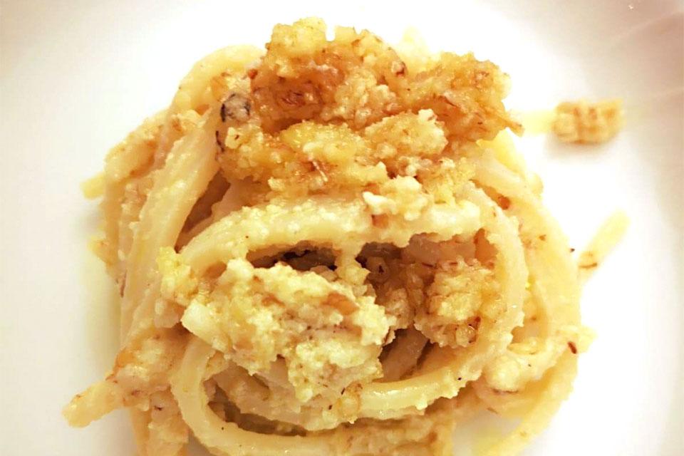 ... chitarra con molliche di pane grattugiate e condite con aglio, prezzemolo fresco e noci sminuzzate. Il segreto? Poca acqua di cottura, olio extravergine nelle molliche e quando mantecate la chitarra. Buona Vigilia di Natale