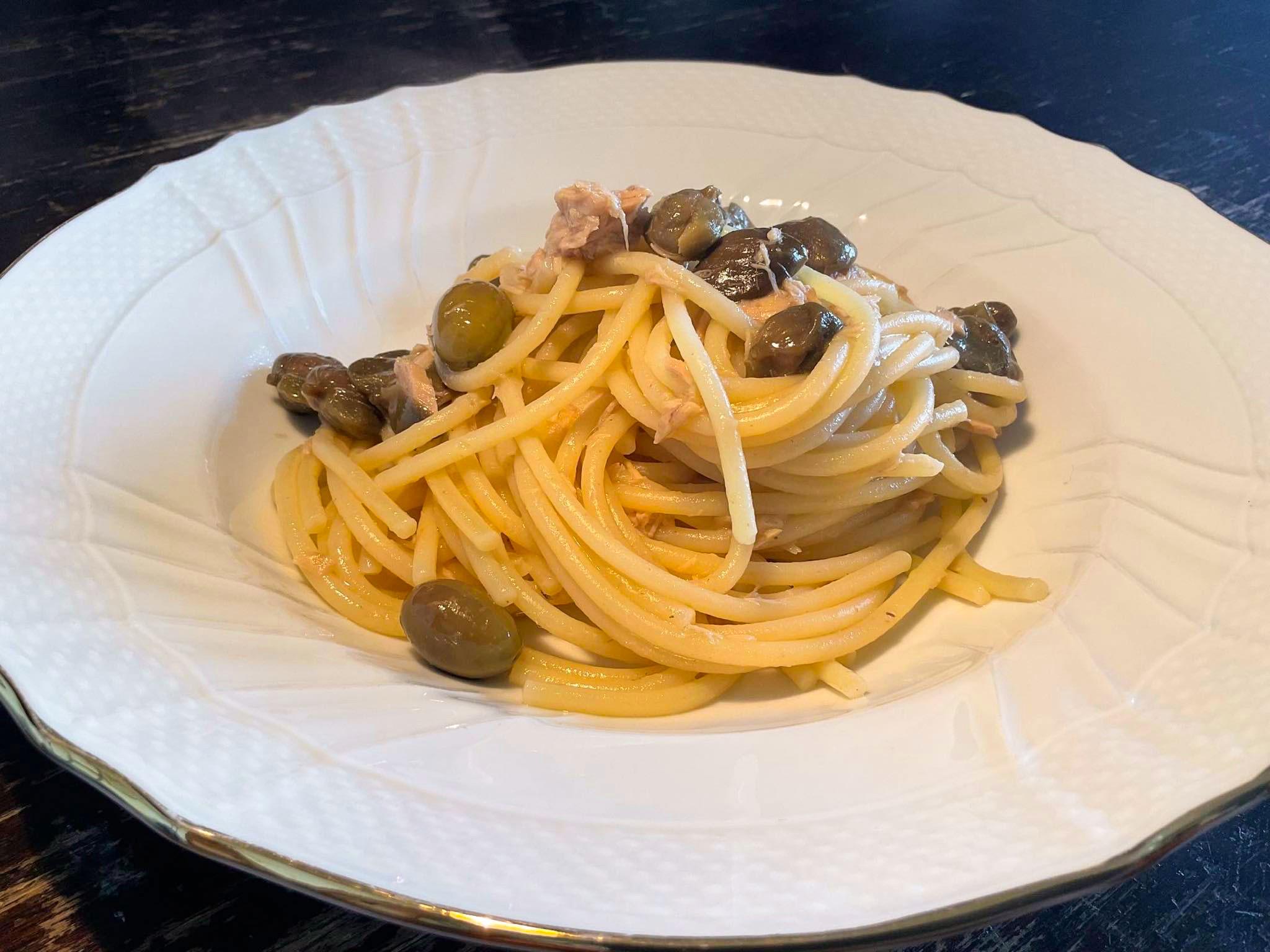 Con un primo piatto, diremmo unico, costruito intorno ai nostri Spaghetti Cappelli Originale 1915. Tonno in scatola sott'olio dalla Sicilia, capperi di Pantelleria, ovvio, e due olive verdi non ce le mettiamo?
