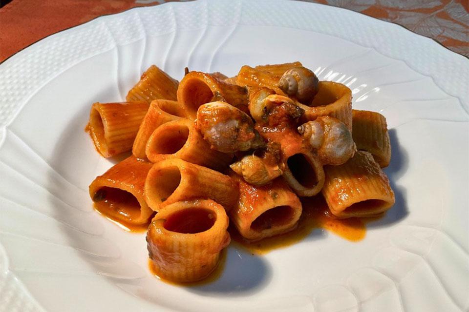 Oggi, a Casa Latini, mezze maniche integrali con lumachine di mare, finocchietto selvatico, maggiorana, aglio, cipolla, passata di pomodoro e un cucchiaio di concentrato.Attenzione ai guscetti...