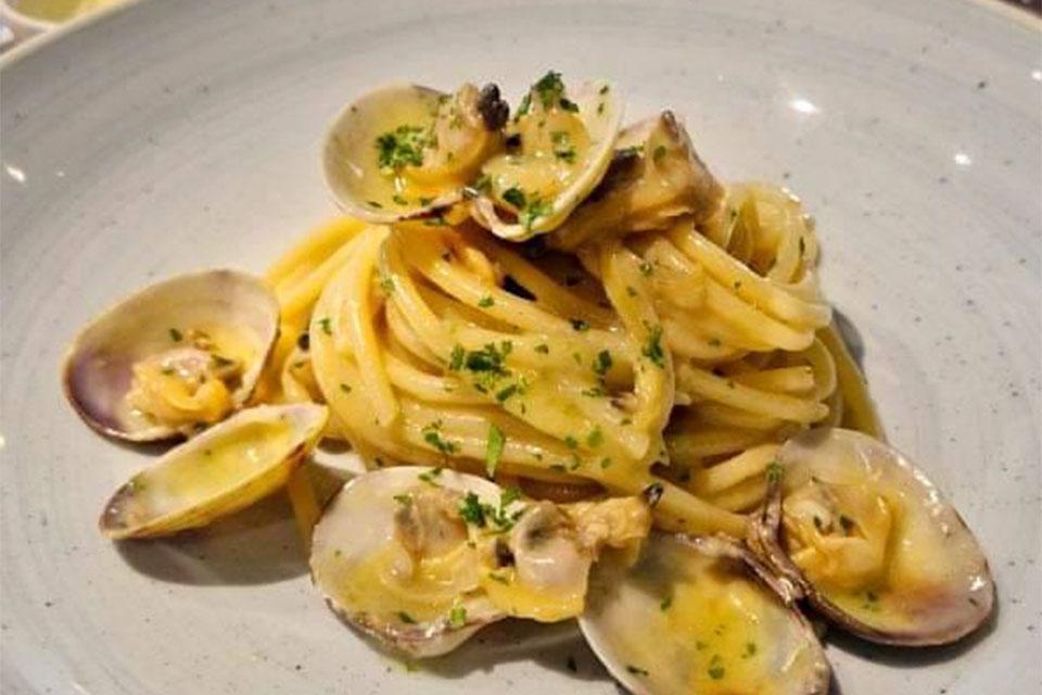 ... da Oscar Mazzoleri. In un luogo magico dove il buon bere è di altissimo livello e il cibo vale la sosta. Qui le materie prime danno lustro alla nostra pasta: Spaghetti grandi con le vongole.