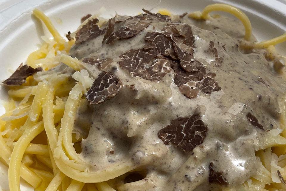 Piatto: Chitarra all'uovo, fonduta di Casciotta d'Urbino, Bianchetto