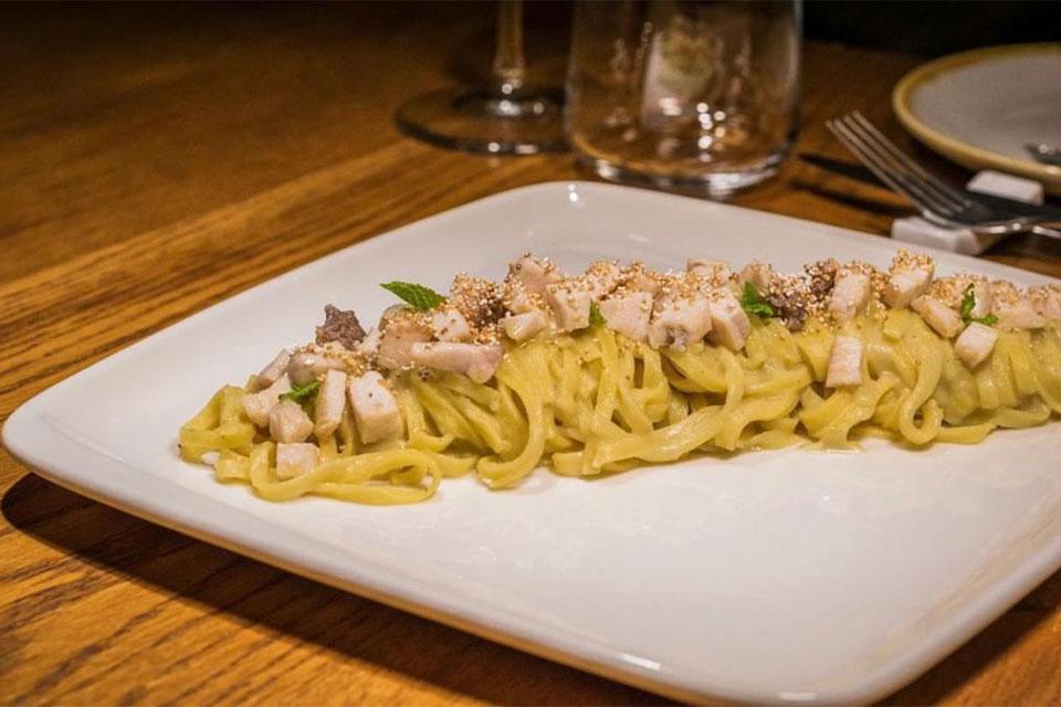 Tutta la Famiglia Peluso si è trasferita e nel Ristorante Mamie, che in francese vuol dire nonna, porta la sua veracità salentina. Come questi Tagliolini all'uovo con crema di melanzane, pesce spada, menta e pop corn di amaranto. Buon Sabato e buon Aprile