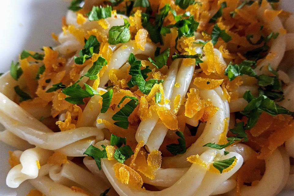L'importante che sia fresco e tagliato con le forbici come questo con le nostre Caserecce e la bottarga a scaglie...