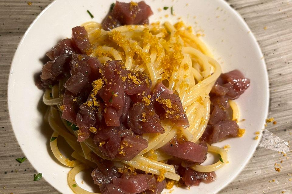 Il Ristorante Patty di Diego Silvestri è aperto tutto l'anno. Qui l'Estate non lascia spazio all'Inverno e splende in piatti come questo. Spaghetti Grandi, tonno crudo e bottarga. Una meraviglia di bontà