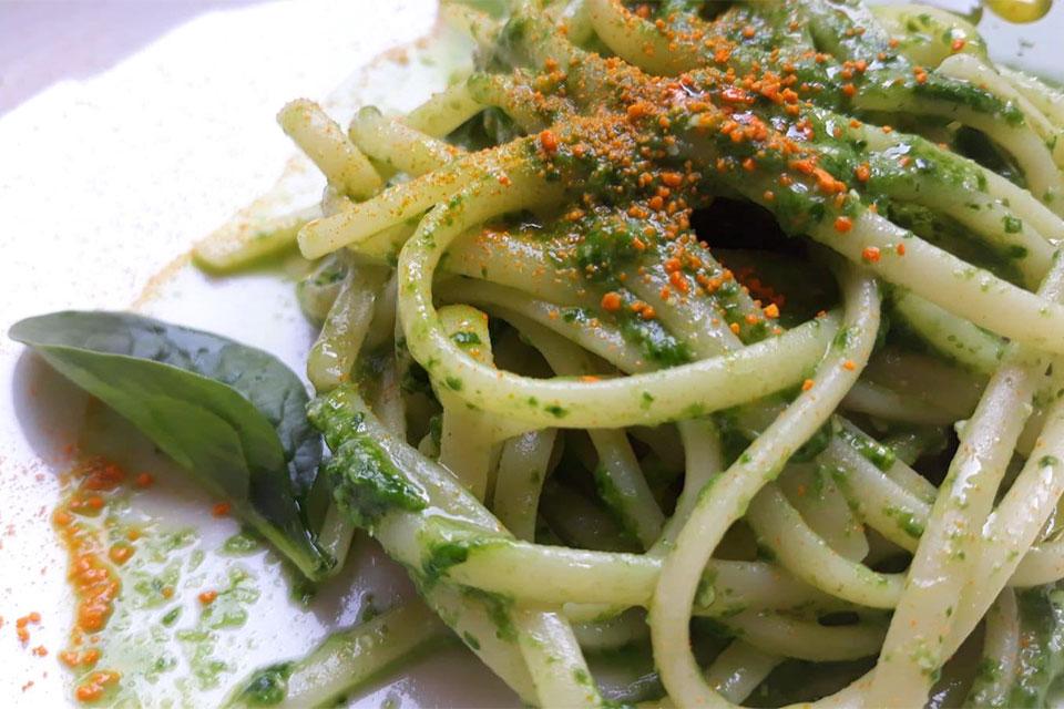 Certe preparazioni rimangono, come si dice, sempre verdi e di successo anche con il passare del tempo. Come queste trenette firmate da Marco Domenella lo Chef patron de l'Hosteria La Marca a Camerano con pesto di spinacini e curcuma in polvere. Leggere, veloci e molto buone.