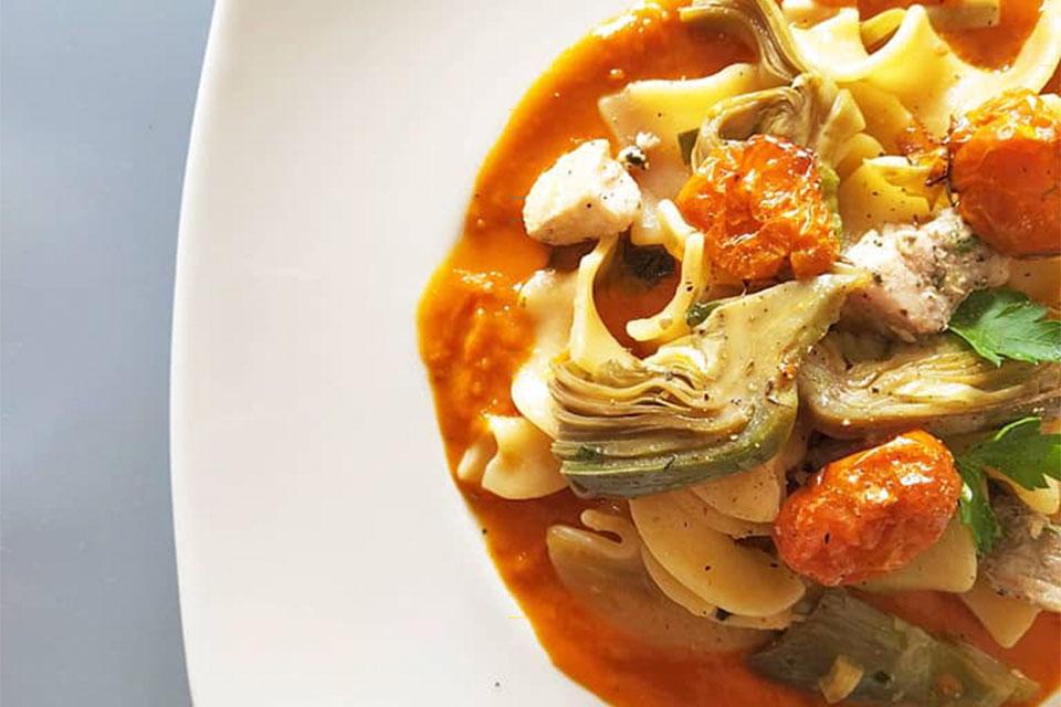 Maria Nasso è una cuoca artista. Usa la sua eccellente e professionale manualità per dare agli ingredienti aspetti diversi e scolpiti. Un'arte antica che vuole dare risalto ai colori e spazio al divertimento e, se volete, all'equivoco. Per noi, oggi, Trucioli con carciofi, pesce spada, datterini arancioni in salsa e confit. Buon Martedì