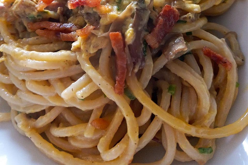 Accogliamo il mese che porta la Primavera con un piatto di Orietta la moglie Chef del Maestro Gualberto Compagnucci. Spaghetti grandi alla carbonara classica con l'aggiunta di carciofi. Una semplice bontÃ
