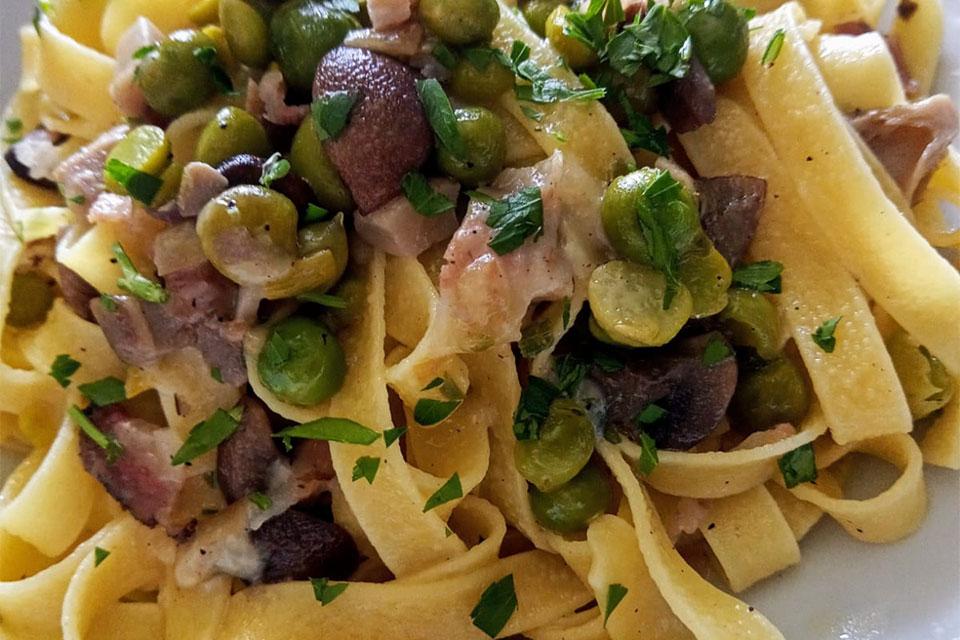 ... tagliatelle all'uovo, funghi, pancetta e piselli.