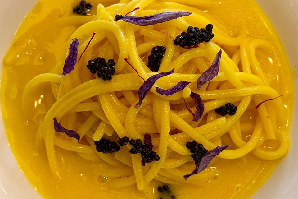 ... è con burro acido, zafferano della California con i suoi fiori e Caviale Calvisius.