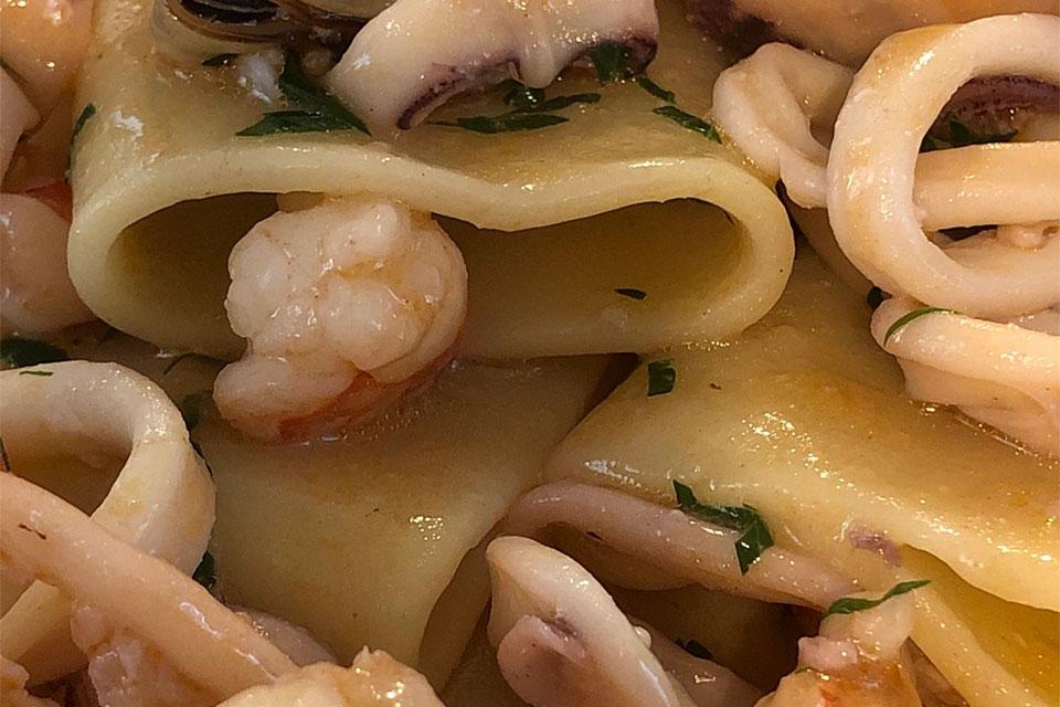 I suoi piatti honno sempre un aspetto ricco e gaudente. Come questi mezzi paccheri che profumano intensamente di mare. Buo Giovedì