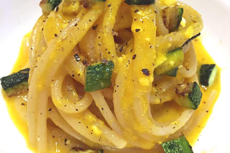 Questa volta la fa da padrone lo zabaione allo zafferano e i dadini croccanti del verde delle zucchine.
