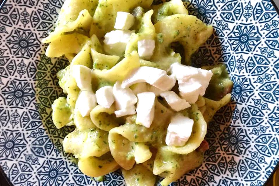 La composizione di questi trucioli la racconta così: zucchina sbollentata e montata con olio Evo, fondo di scalogno e speck altoatesino, cubetti di bufala.