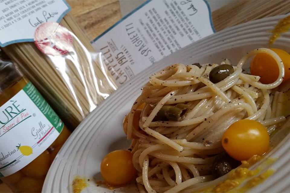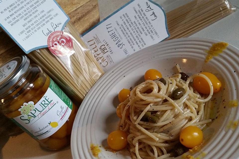 Carol Agostini, donna vulcanica e dalle mille risorse, ogni tanto, da ottima cuoca quale è, si diverte a giocare con la nostra pasta. Oggi studiato i nostri spaghetti Cappelli e li ha fatti con pomodorino giallo al naturale della Sapurè, l'olio extravergine d'oliva di Alberto Giachi, con pesteda della Valtellina e olive taggiasche.