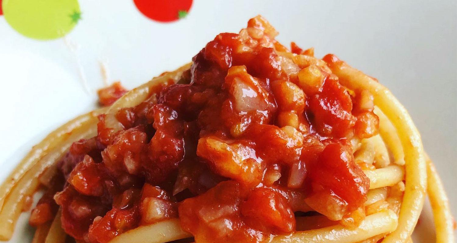 In questo caso l'aglione viene fatto cucinare, sbucciato, all'interno del sugo, finchè non diventa morbido da schiacciare con la forchetta. Un altro punto in comune. Entrambe le coppie amano i bucatini