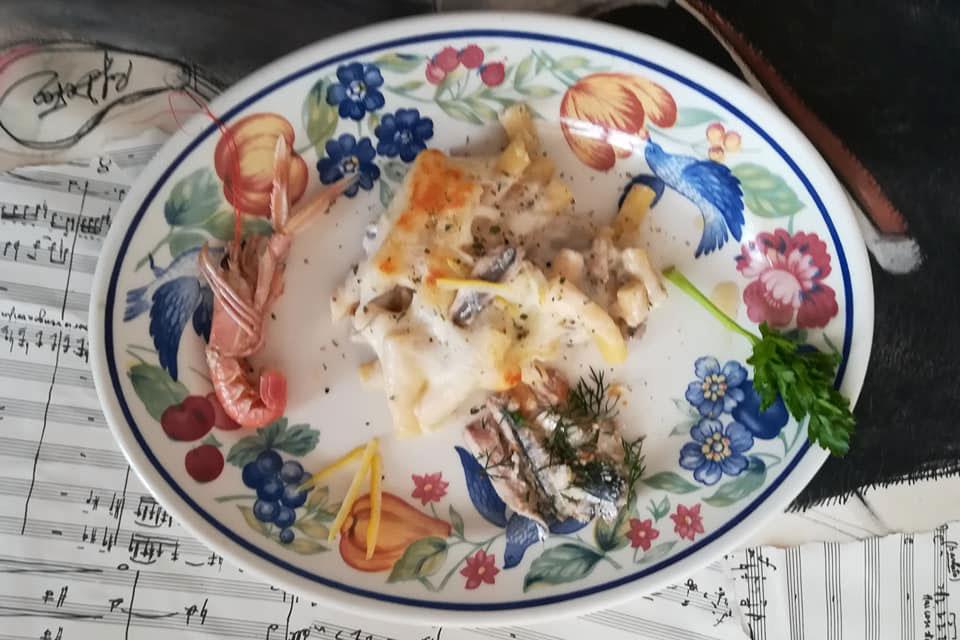 Raffaele De Feo, uno dei massimi esperti del grande compositore pesarese Gioacchino Rossini, interpreta, inventa, studia una delle tante versioni dei maccheroni che la Nonna del grande compositore potrebbe aver preparato per il nipote. Questi sono con casciotta di Urbino, alici, besciamella. Gratinati al forno.