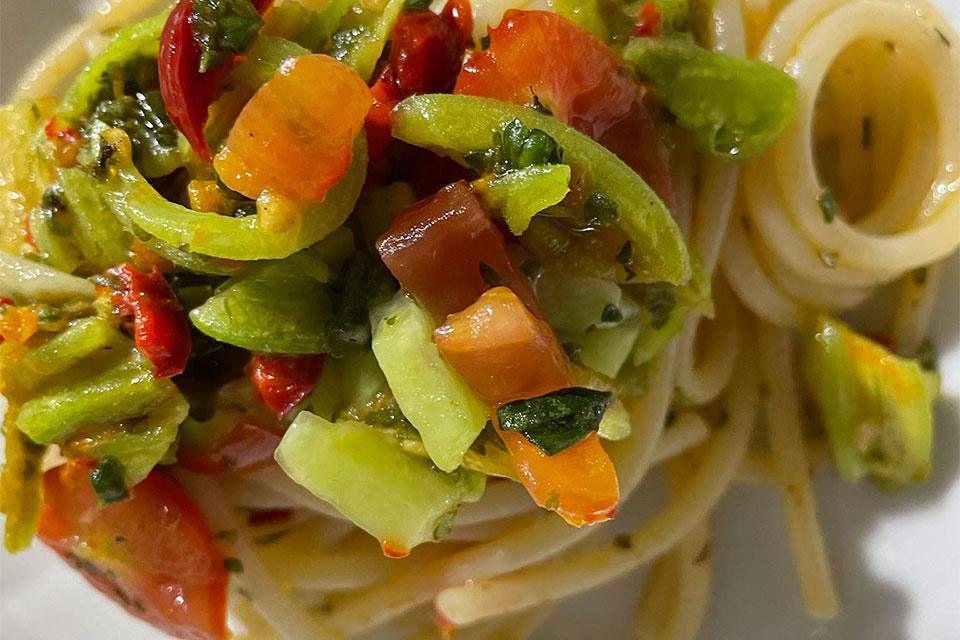 Raccogliamo di tutto: melanzane, zucchine, pomodori, cipolle, cetriolini, sedano, peperoni e facciamo una sorta di pasta fredda, diciamo appena tiepida, con gli spaghettini. Che ne dite?Buona Domenica!