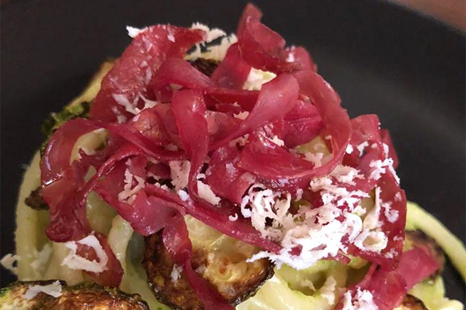 Le zucchine sono in due consistenze, la bresaola è croccante e poi c'è la ricotta mustia.