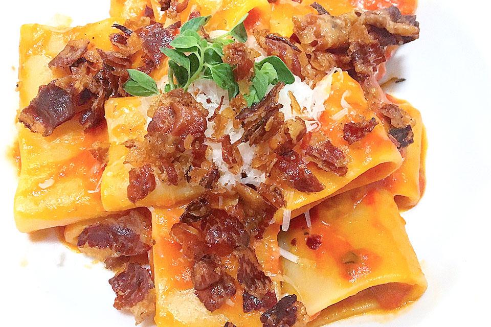 Bastano pochi mezzi paccheri, lo stretto indispensabile, per l'amatriciana firmata da Lorenzo Linguini.Della serie #lericettedegliamici