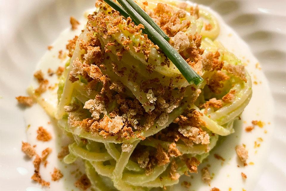 Scoliamo la pasta e teniamo a parte un po’ di acqua di cottura che metteremo in una padella con il pesto di zucchine, uniamo la pasta scolata al dente e amalgamiamo delicatamente. Impiattiamo gli spaghetti sulla crema di burrata e finiamo il piatto con la granella di pane