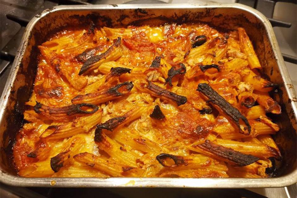 Questo Timballo è fatto con penne Latini, mozzarella del giorno prima, gli avanzi di sugo di una parmigiana, gli avanzi di ripieno di un calzone di cipolle e un po' di tonno in scatola. La superficie è stata volutamente bruciacchiata, chiamiamo all'assassina pure questo timballo tanto per essere originali ?