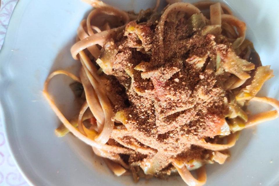 Un omaggio che arriva da Palermo. dalla cucina colta di Antonino Lauria.Tagliatelle integrali con la muddica e un 'raggio di sole'