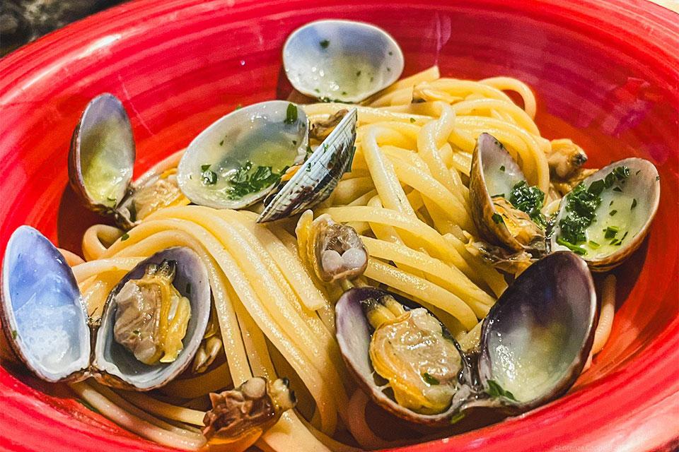 Trenette alle vongole su piatto rosso fiamma! Buon fine settimana!