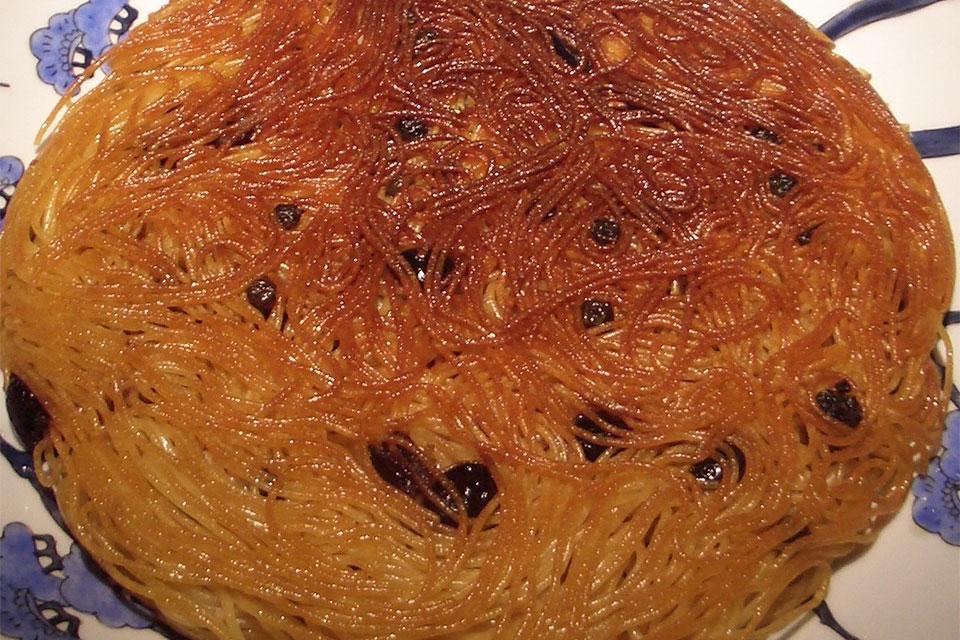 Mentre la pasta si cuoce, versare l'olio in un pentolino, portarlo a temperatura su fuoco medio e rosolarvi dentro gli spicchi d'aglio per poi eliminarli. Versare nel pentolino le olive e i capperi e le acciughe e disfare queste ultime a fuoco leggero. In una grande padella antiaderente formare uno strato con un terzo degli spaghetti dopo aver unto d'olio la padella medesima. Versare uniformemente una metà dell'intingolo preparato in precedenza sullo strato di pasta. Coprire con un ulteriore strato di spaghetti, versare uniformemente sulla superficie il resto dell'intingolo ed infine coprire il tutto con un ultimo strato di spaghetti.